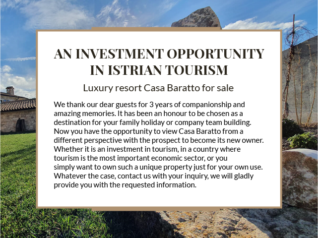 Casa Baratto is an ideal combination of modern conveniences and traditional charm for your holiday. A luxurious, open-concept interior, bearing elements of traditional Istrian architecture, continues onto a large, covered terrace, making it ideal for large gatherings in a true Mediterranean ambience with a view of the sea.